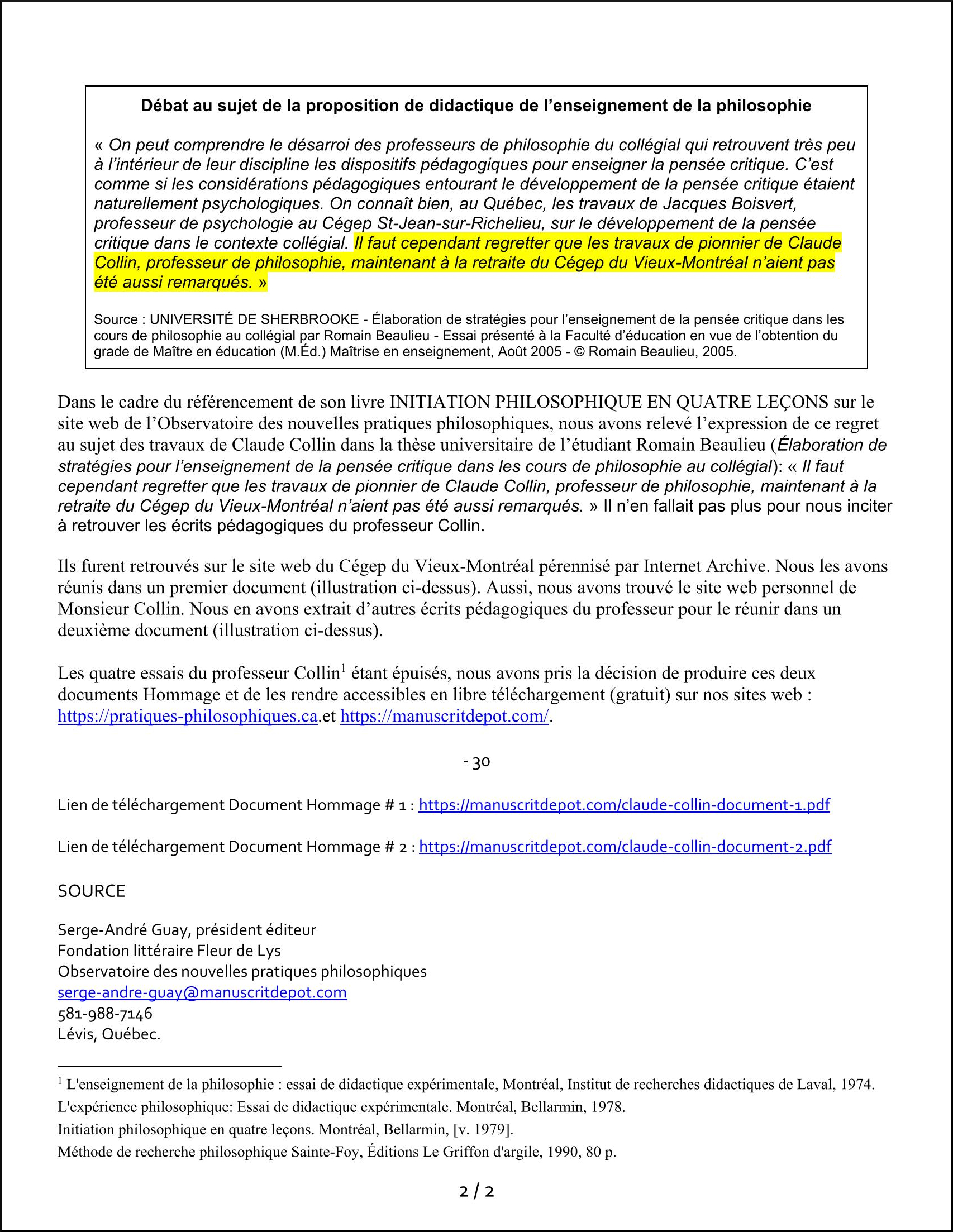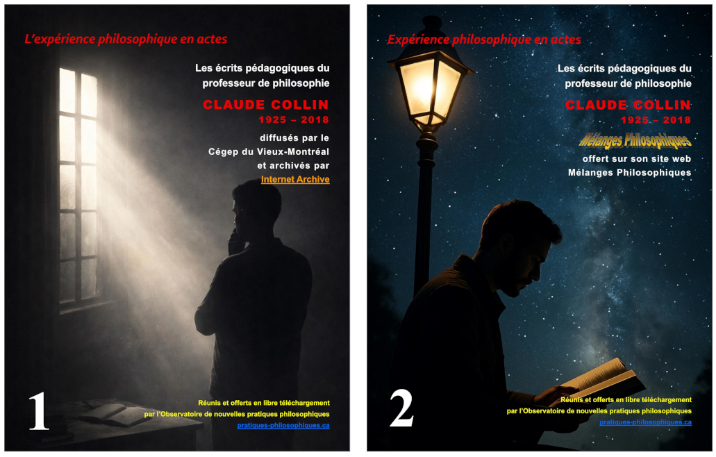 Les quatre essais du professeur Collin[1] étant épuisés, nous avons pris la décision de produire ces deux documents Hommage et de les rendre accessibles en libre téléchargement (gratuit) sur nos sites web : https://pratiques-philosophiques.ca et https://manuscritdepot.com/.