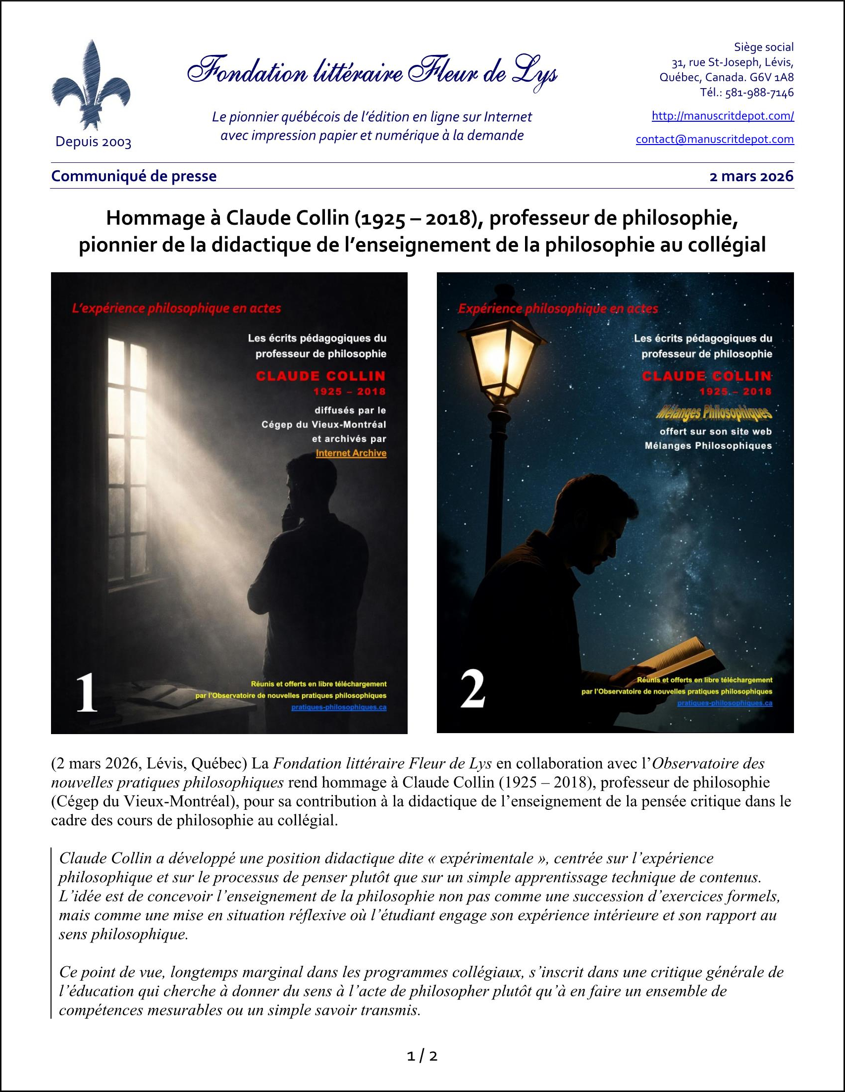 (2 mars 2026, Lévis, Québec) La Fondation littéraire Fleur de Lys en collaboration avec l’Observatoire des nouvelles pratiques philosophiques rend hommage à Claude Collin (1925 – 2018), professeur de philosophie (Cégep du Vieux-Montréal), pour sa contribution à la didactique de l’enseignement de la pensée critique dans le cadre des cours de philosophie au collégial.