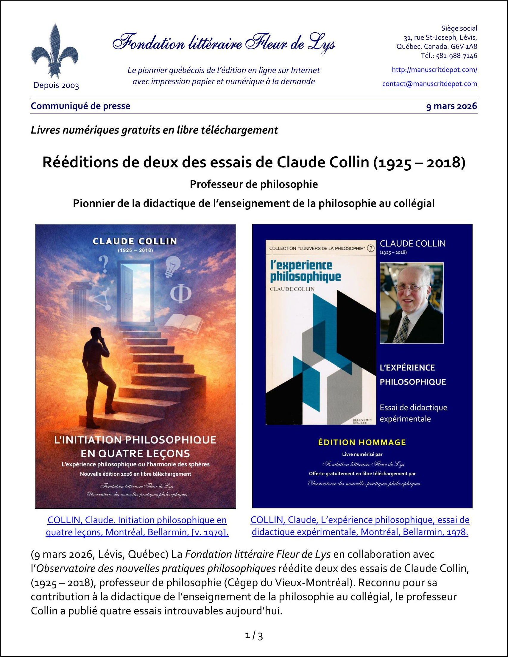(9 mars 2026, Lévis, Québec) La Fondation littéraire Fleur de Lys en collaboration avec l’Observatoire des nouvelles pratiques philosophiques réédite deux des essais de Claude Collin, (1925 – 2018), professeur de philosophie (Cégep du Vieux-Montréal). Reconnu pour sa contribution à la didactique de l’enseignement de la philosophie au collégial, le professeur Collin a publié quatre essais introuvables aujourd’hui.