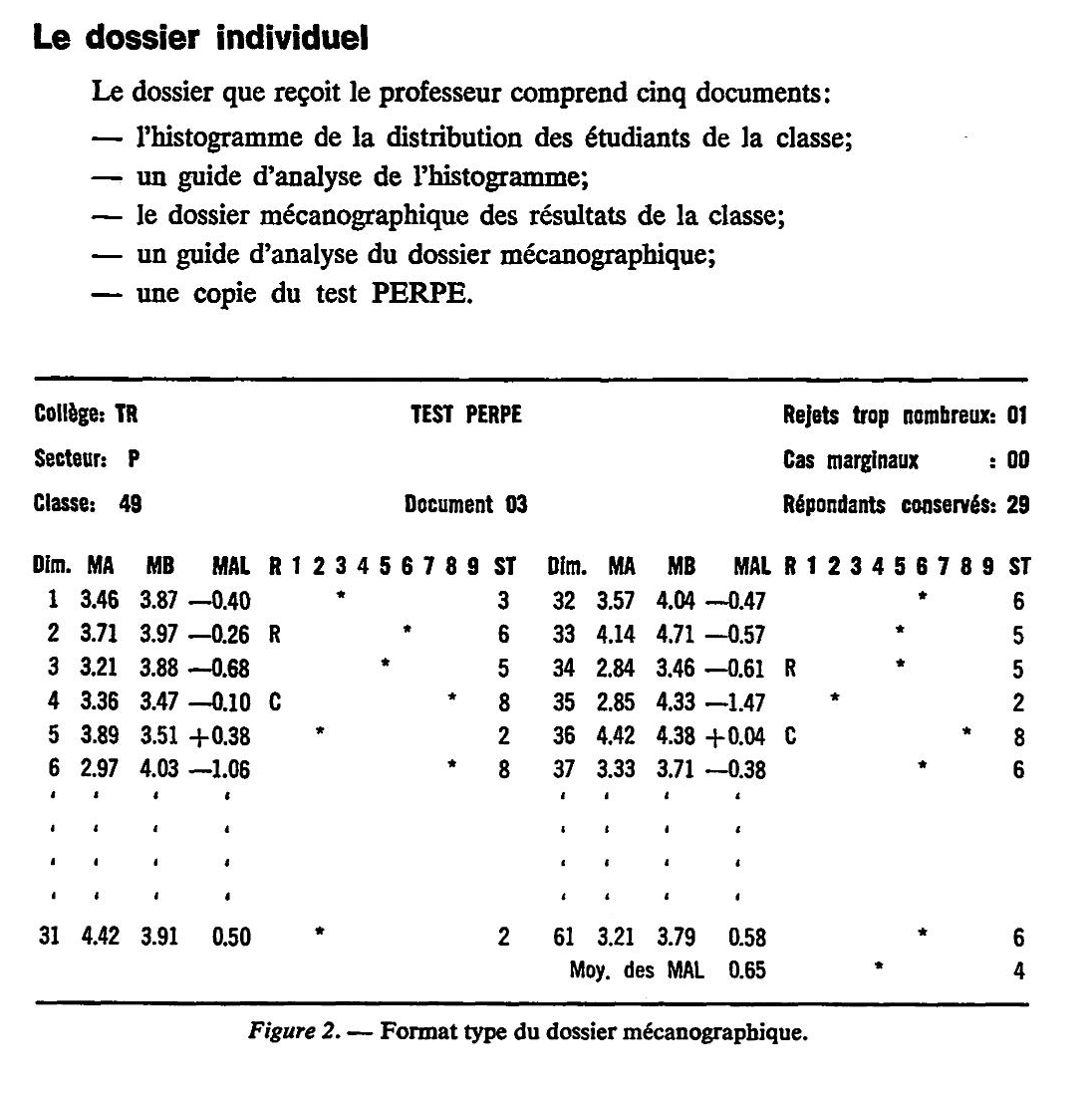 Second document produit par l’ordinateur, le dossier mécanographique réunit toutes les données présentées au professeur. La figure 2 illustre le format-type de ce dossier. Un premier groupe d’informations administratives permet d’identifier :