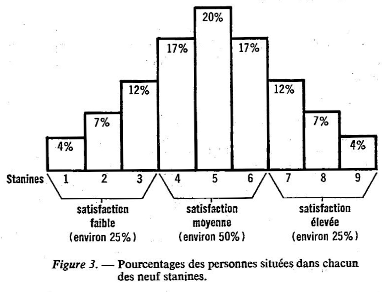 Le professeur qui veut un diagnostic social rapide sait, par exemple, qu’un stanine 7, 8 ou 9 le situe dans le quart supérieur de ce groupe. S’il veut un diagnostic social plus précis, il peut examiner les pourcentages exacts de chacune des neuf catégories. Il saura ainsi qu’un stanine 9 signifie qu’il est jugé plus satisfaisant que 96% de ses collègues et qu’un stanine 2 veut dire qu’il est jugé moins satisfaisant que 89% de ses collègues.