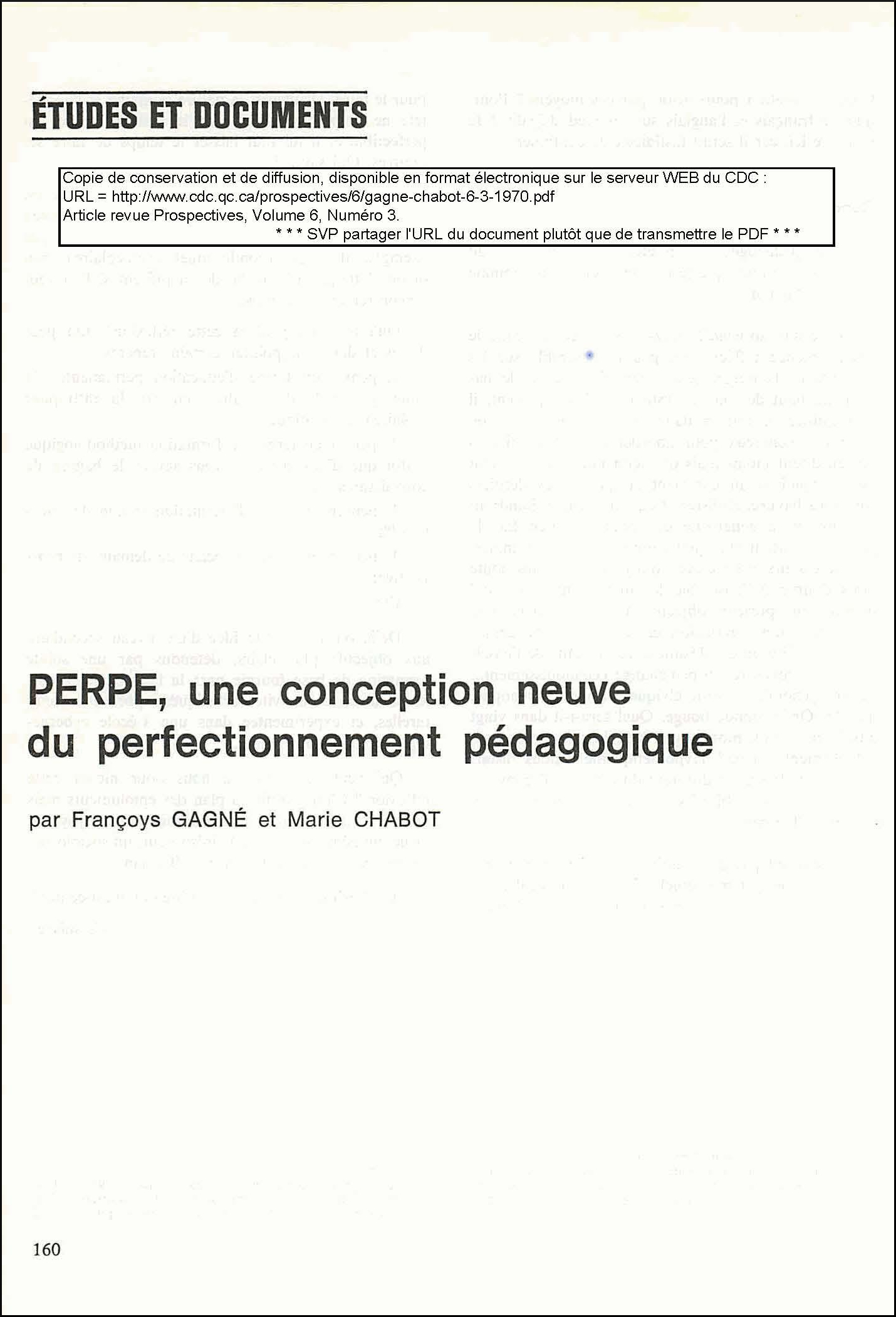 [2] voir François. GAGNÉ et Marie CHABOT, « PERPE, une conception neuve du perfectionnement pédagogique », dans Prospectives, Vol. 6, no 3, juin 1970.