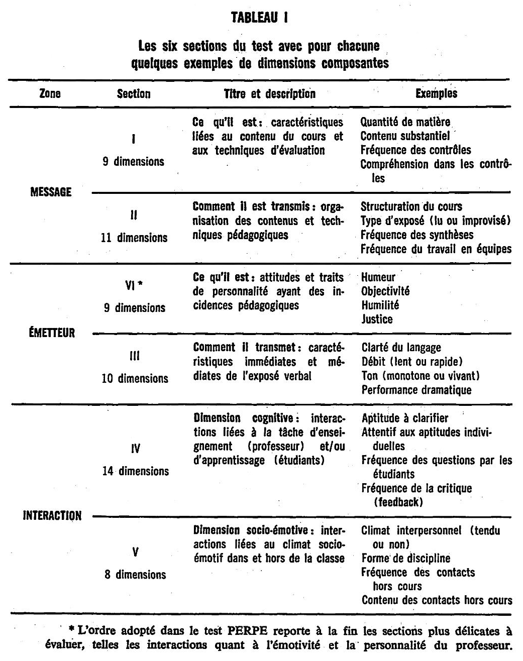 Les 61 dimensions du test PERPE peuvent être regroupées de diverses façons dans le but de constituer des sections 3 relativement homogènes. Nous avons pu nous-mêmes constater que les formes de regroupements variaient sensiblement selon le modèle ou la conception que chaque juge se faisait de la a situation d’enseignement 3. Vous trouverez dans le tableau 1, toute discutable qu’elle soit, la plus récente de nos tentatives. En outre, pour fournir une meilleure image du contenu du test PERPE, ce même tableau donne quelques titres de dimensions caractéristiques de chaque section. il faut bien se rappeler B la lecture de ces titres que chacun est accompagné d’une description opérationnelle qui clarifie le sens précis du titre.