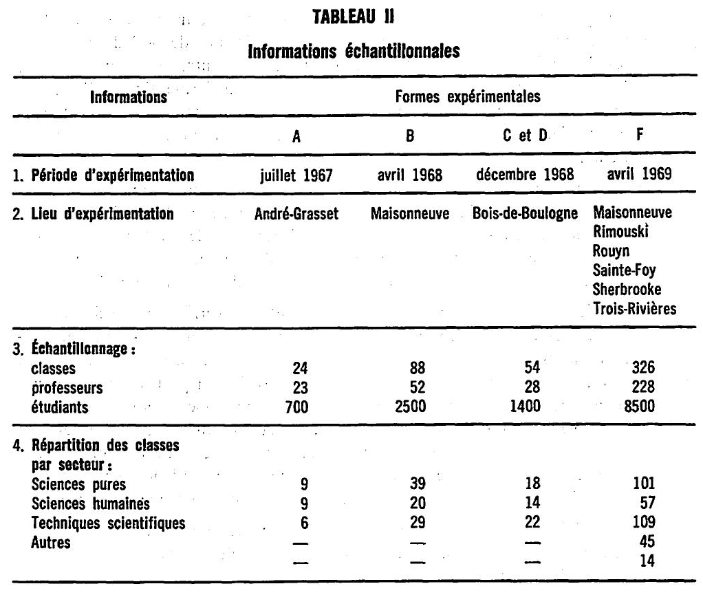 Ainsi que nous l’avons déjà souligné, il a fallu plus de trois années de travaux scientifiques pour construire le test PERPE. Durant cette période, près d’une vingtaine de spécialistes (chercheurs, statisticiens, stagiaires universitaires) ont collaboré à la mise au point de l’instrument. Quelques statistiques globales donneront une idée de l’envergure de ce projet : nous avons administré cinq formes différentes du test PERPE à plus de 13 000 étudiants, dans 500 classes, avec la collaboration de 330 professeurs. Huit collèges ont collaboré aux diverses étapes expérimentales. Le tableau II résume pour chacune des expérimentations effectuées les principales statistiques descriptives concernant les échantillons réunis.