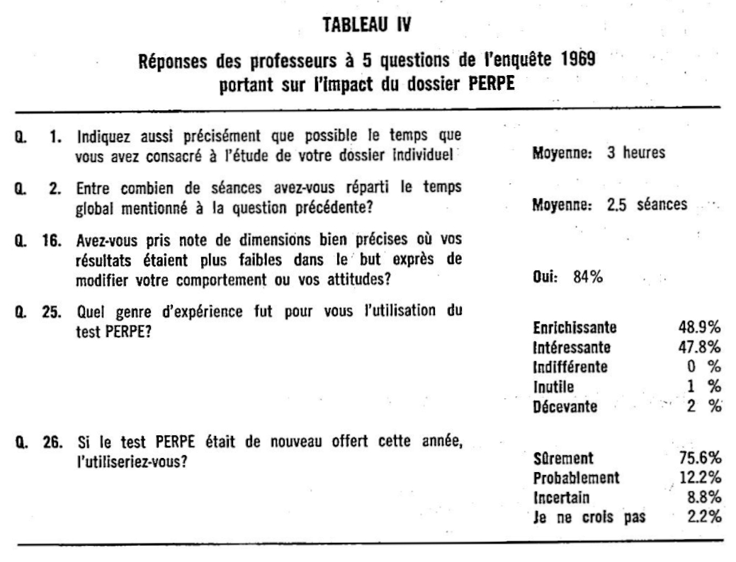 Notre première réponse à cette question provient du sondage mené en 1969 auprès des 228 professeurs qui avaient utilisé PERPE. Une centaine d’entre eux y ont répondu et nous ont permis d’analyser leurs réactions vis-à-vis du test. Nous présentons au tableau 4 leurs réponses à 5 questions concernant l’impact du dossier PERPE. Ce tableau nous permet de voir que les professeurs n’envisagent pas leur dossier à la légère (Q. 1 et 2), puisqu’ils prennent pour l’étudier 3 heures, en moyenne, réparties sur 2 ou 3 séances (certains d’entre eux l’ont même étudié durant 8 à 9 heures !). En réponse à la question 16, 84% affirment avoir noté des résultats plus faibles dans le but de modifier leur comportement ou leurs attitudes, tandis que dans l’ensemble (Q. 25) l’utilisation du test fut une expérience ENRICHISSANTE ou INTÉRESSANTE pour 96% d’entre eux. En fin de compte, 88% des répondants réutiliseraient SÛREMENT ou PROBABLEMENT le test PERPE.