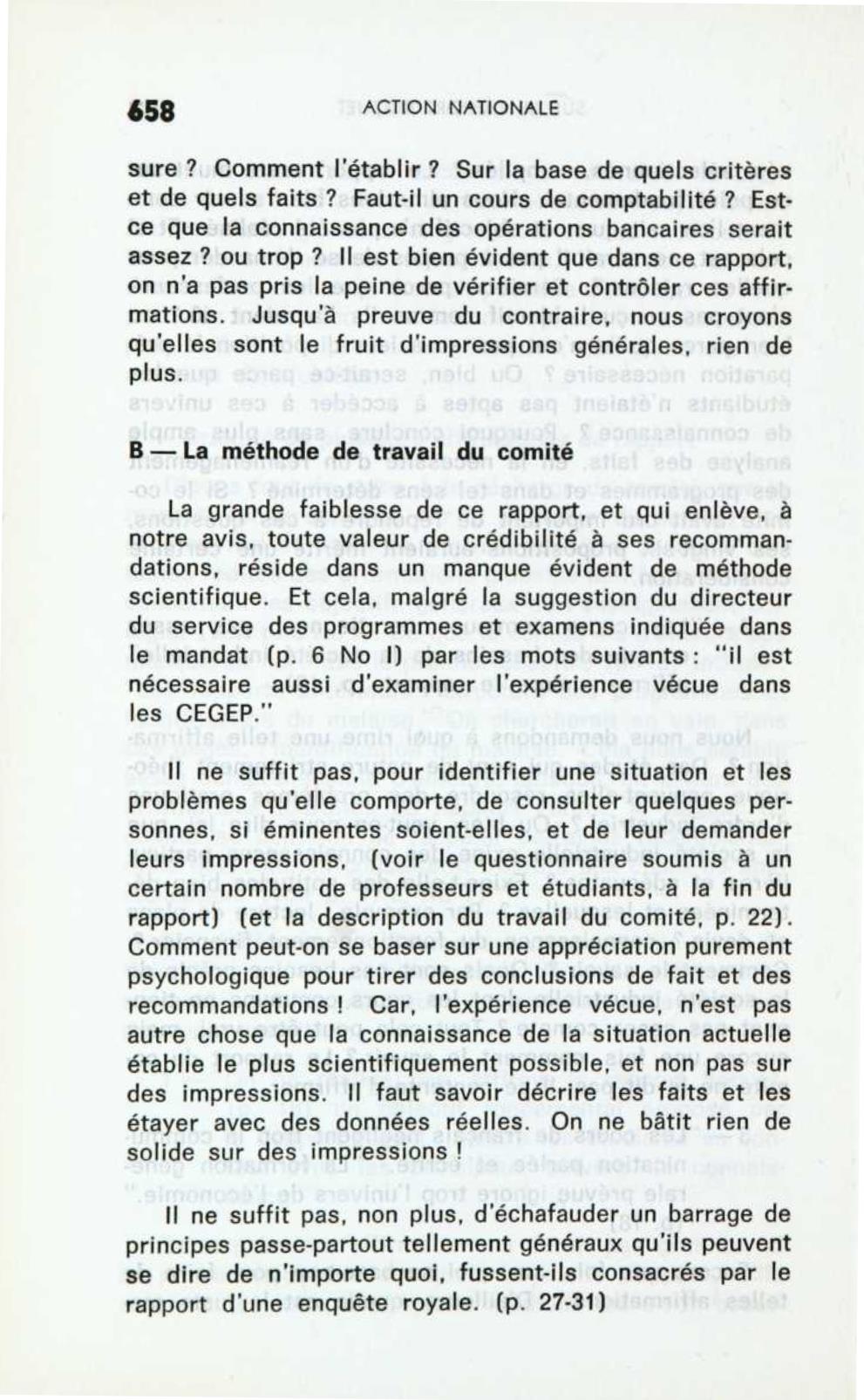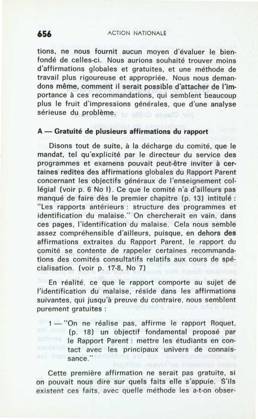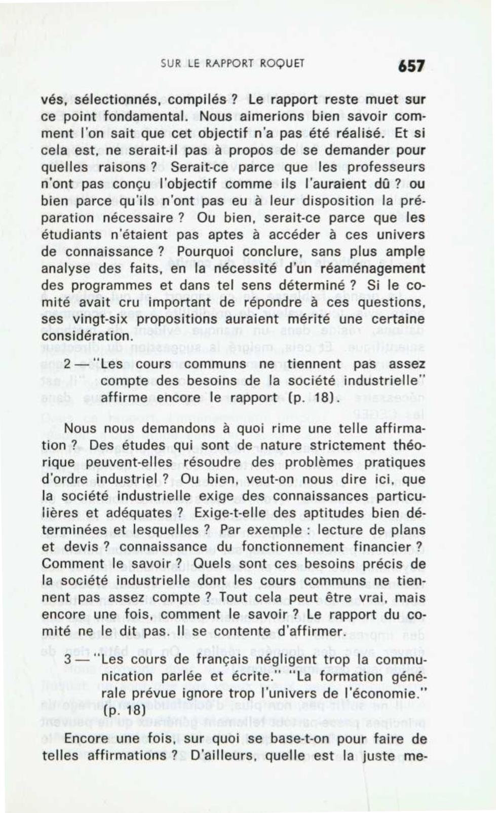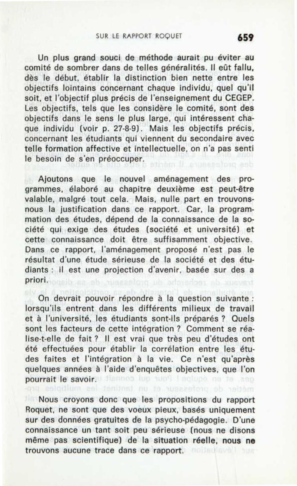 Un plus grand souci de méthode aurait pu éviter au comité de sombrer dans de telles généralités. Il eût fallu, dès le début, établir la distinction bien nette entre les objectifs lointains concernant chaque individu, quel qu’il soit, et l’objectif plus précis de l’enseignement du CEGEP. Les objectifs, tels que les considère le comité, sont des objectifs dans le sens le plus large, qui intéressent cha- que individu (voir p. 27-8-9). Mais les objectifs précis, concernant les étudiants qui viennent du secondaire avec telle formation affective et intellectuelle, on n’a pas senti le besoin de s’en préoccuper. Ajoutons que le nouvel aménagement des pro- grammes, élaboré au chapitre deuxième est peut-être valable, malgré tout cela. Mais, nulle part en trouvons- nous la justification dans ce rapport. Car, la programmation des études, dépend de la connaissance de la société qui exige des études (société et université) et cette connaissance doit être suffisamment objective. Dans ce rapport, l’aménagement proposé n’est pas le résultat d’une étude sérieuse de la société et des étudiants: il est une projection d’avenir, basée sur des a priori. On devrait pouvoir répondre à la question suivante : lorsqu’ils entrent dans les différents milieux de travail et à l’université, les étudiants sont-ils préparés? Quels sont les facteurs de cette intégration ? Comment se réa- lise-t-elle de fait ? Il est vrai que très peu d’études ont été effectuées pour établir la corrélation entre les études faites et l’intégration à la vie. Ce n’est qu’après quelques années à l’aide d’enquêtes objectives, que l’on pourrait le savoir. Nous croyons donc que les propositions du rapport Roquet, ne sont que des vœux pieux, basés uniquement sur des données gratuites de la psycho-pédagogie. D’une connaissance un tant soit peu sérieuse (nous ne disons même pas scientifique) de la situation réelle, nous ne trouvons aucune trace dans ce rapport.