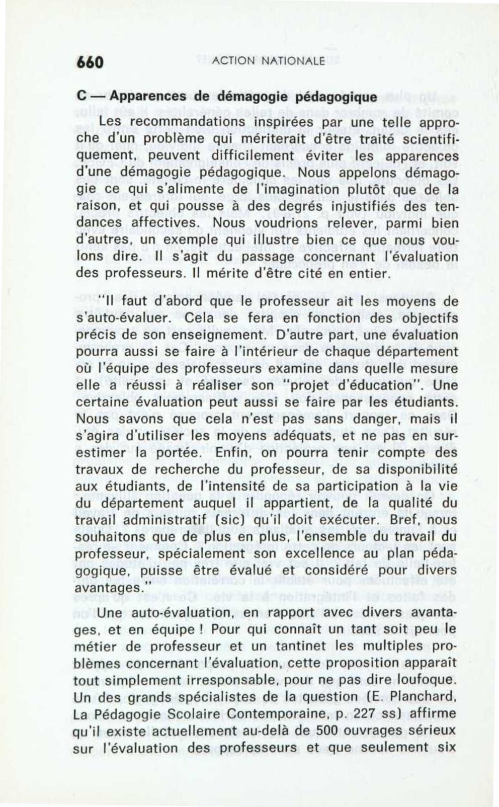 C- Apparences de démagogie pédagogique Les recommandations inspirées par une telle approche d’un problème qui mériterait d’être traité scientifiquement, peuvent difficilement éviter les apparences d’une démagogie pédagogique. Nous appelons démagogie ce qui s’alimente de l’imagination plutôt que de la raison, et qui pousse à des degrés injustifiés des tendances affectives. Nous voudrions relever, parmi bien d’autres, un exemple qui illustre bien ce que nous voulons dire. Il s’agit du passage concernant l’évaluation des professeurs. Il mérite d’être cité en entier. « Il faut d’abord que le professeur ait les moyens de s’auto-évaluer. Cela se fera en fonction des objectifs précis de son enseignement. D’autre part, une évaluation pourra aussi se faire à l’intérieur de chaque département où l’équipe des professeurs examine dans quelle mesure elle a réussi à réaliser son « projet d’éducation ». Une certaine évaluation peut aussi se faire par les étudiants. Nous savons que cela n’est pas sans danger, mais il s’agira d’utiliser les moyens adéquats, et ne pas en sur- estimer la portée. Enfin, on pourra tenir compte des travaux de recherche du professeur, de sa disponibilité aux étudiants, de l’intensité de sa participation à la vie du département auquel il appartient, de la qualité du travail administratif (sic) qu’il doit exécuter. Bref, nous souhaitons que de plus en plus, l’ensemble du travail du professeur, spécialement son excellence au plan pédagogique, puisse être évalué et considéré pour divers avantages. » Une auto-évaluation, en rapport avec divers avantages, et en équipe ! Pour qui connaît un tant soit peu le métier de professeur et un tantinet les multiples problèmes concernant l’évaluation, cette proposition apparaît tout simplement irresponsable, pour ne pas dire loufoque. Un des grands spécialistes de la question (E. Planchard, La Pédagogie Scolaire Contemporaine, p. 227 ss) affirme qu’il existe actuellement au-delà de 500 ouvrages sérieux sur l’évaluation des professeurs et que seulement six ou sept méthodes sont actuellement connues et qui ont quand même l’inconvénient de ne pas présenter suffisamment d’objectivité et de véracité. Et l’on propose de s’auto-évaluer ! Ou bien le professeur dit la vérité et alors c’est la fin de son travail, car il n’y a personne dont le travail soit à cent pour cent acceptable; ou bien il ne dit pas la vérité: il est clair alors, qu’il faut une hétéro- évaluation. Dans quelle mesure alors fera-t-elle contre- poids à l’auto-évaluation ? Au fond, le problème du professeur est bien différent. D’abord, comment préparer le cours pour qu’il soit à la fois fidèle au programme et adapté aux étudiants ? Ensuite, quels moyens didactiques utiliser et comment? Cela suppose, évidemment, une sérieuse connaissance de toute la science pédagogique. Seule cette science peut prévenir les écarts de la démagogie pédagogique. Conclusion À notre avis, à la suite de ce rapport, le problème des cours communs reste entier. Ne conviendrait-il pas de confier le travail, non à un comité aux moyens restreints, mais à une équipe de chercheurs dont la seule occupation serait de décrire aussi fidèlement que possible la situation de l’enseignement et de son influence réelle sur la société, en tenant compte séparément des différents secteurs de l’enseignement. À l’aide d’une méthode scientifique appropriée, il serait possible de faire des recommandations qui pourraient s’appuyer sur des faits précis et bien observés. Pourquoi privilégier l’improvisation dans un domaine aussi important que l’enseignement ?