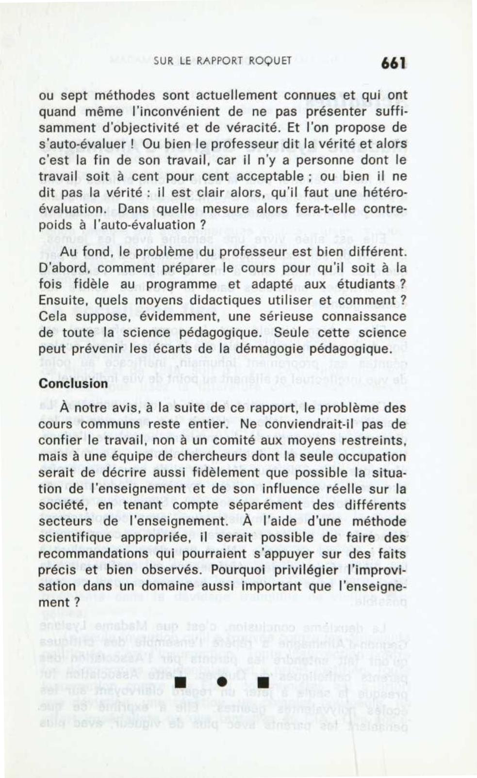REMARQUES Soulignons que cette référence au « slogan des années récentes » vient en contradiction avec notre conception du travail scientifique en pédagogie. Nous avons toujours combattu les conceptions pédagogiques issues des tendances idéologiques, psychologiques et sociologiques, qui sont souvent à l’origine de modes passagères. Nous l’avons fait, en particulier, dans un article sur le rapport Roquet, publié en 1971?, et aussi dans l’Enseignement de la philosophie, p. 5 et 11. C’est la raison, d’ailleurs, pour laquelle nous avons mis beaucoup d’insistance à décrire la méthode de recherche scientifique et, plus particulièrement, le fait pédagogique qui est à la base de notre procédé de recherche.