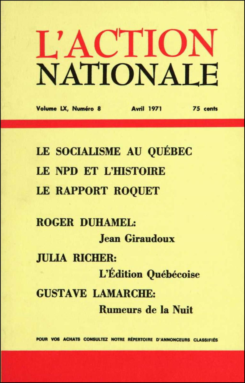 ? « Le rapport Roquet », dans l’Action Nationale, vol. LX, nº 8, et « Le test perpe-philo », dans Prospectives, nov. 1971.