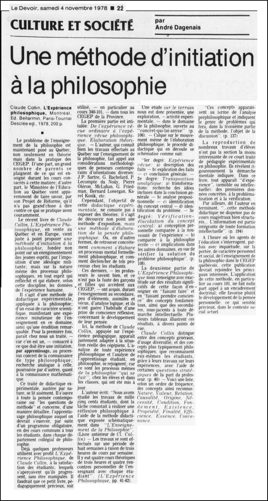 ? André Dagenais, Le Devoir, 4 nov. 1978.