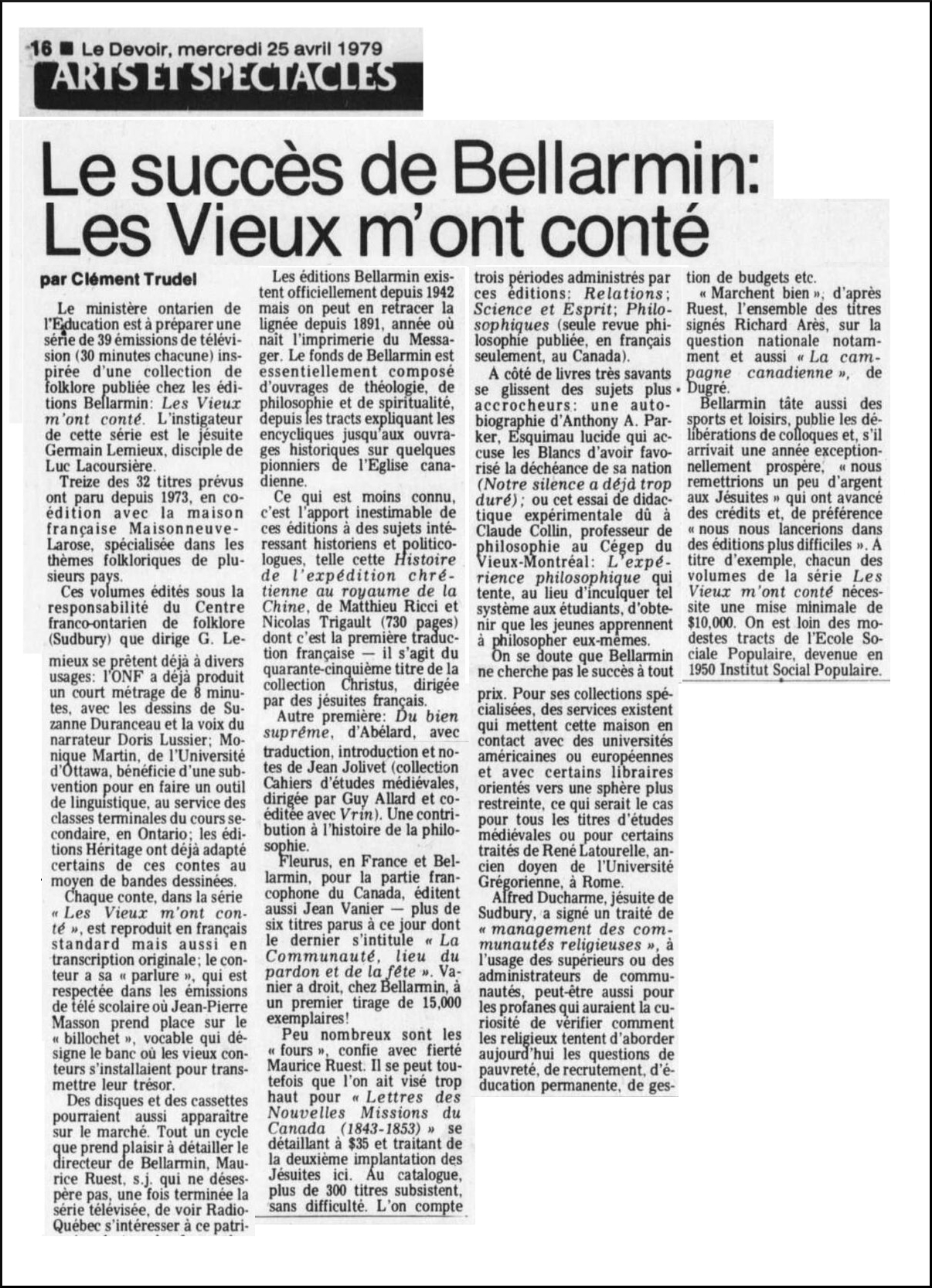 Le succès de Bellarmin: Les Vieux m’ont conté, par Clément Trude, Le devoir, 1979-04-25, Collections de BAnQ.