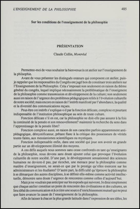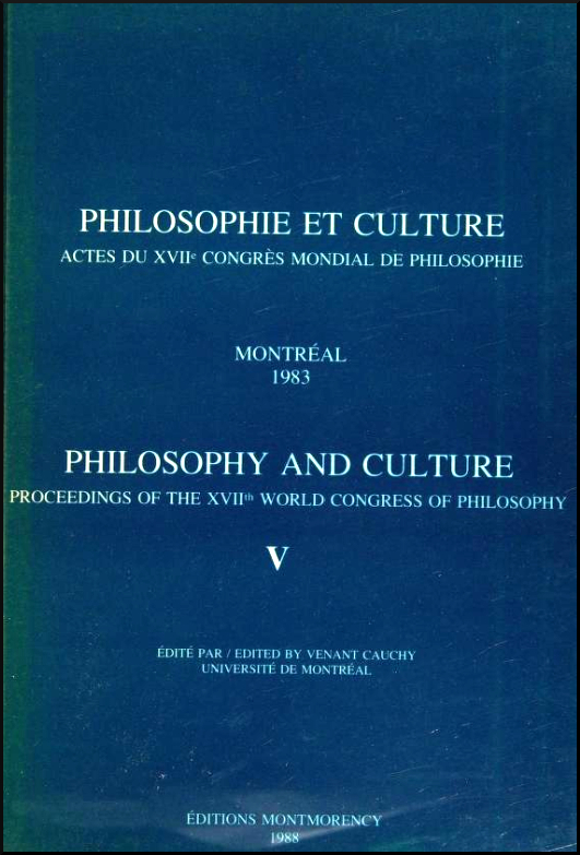 Intervention de Claude Collin, professeur de philosophie au Cégep du Vieux-Montréal lors du XVIIe Congrès mondial de la philosophie sous le thème « Philosophie et culture » qui s’est tenu à Montréal en 1983.