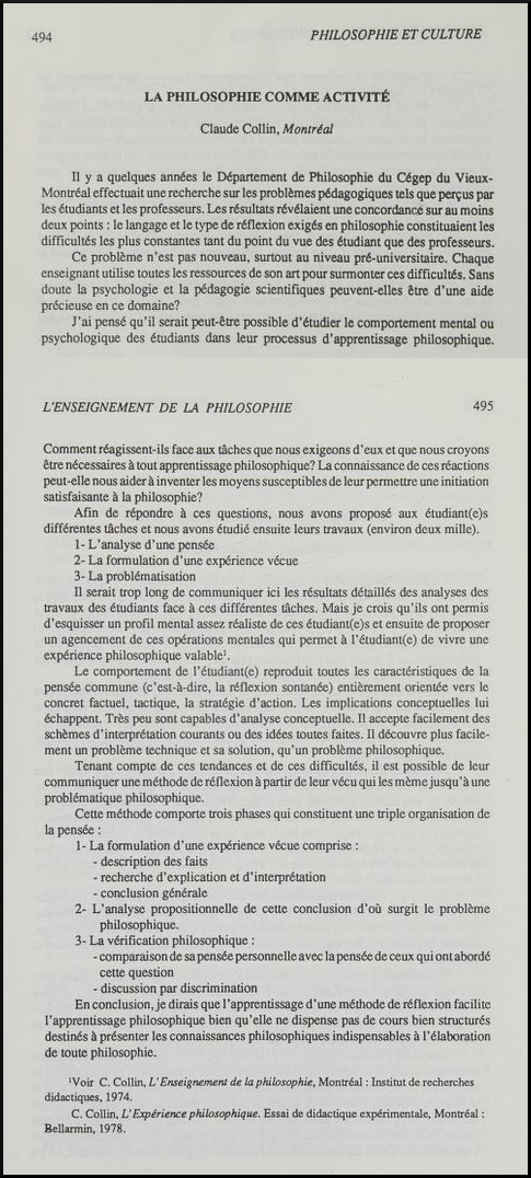 C. Collin, L’Expérience philosophique. Essai de didactique expérimentale, Montréal : Bellarmin, 1978.