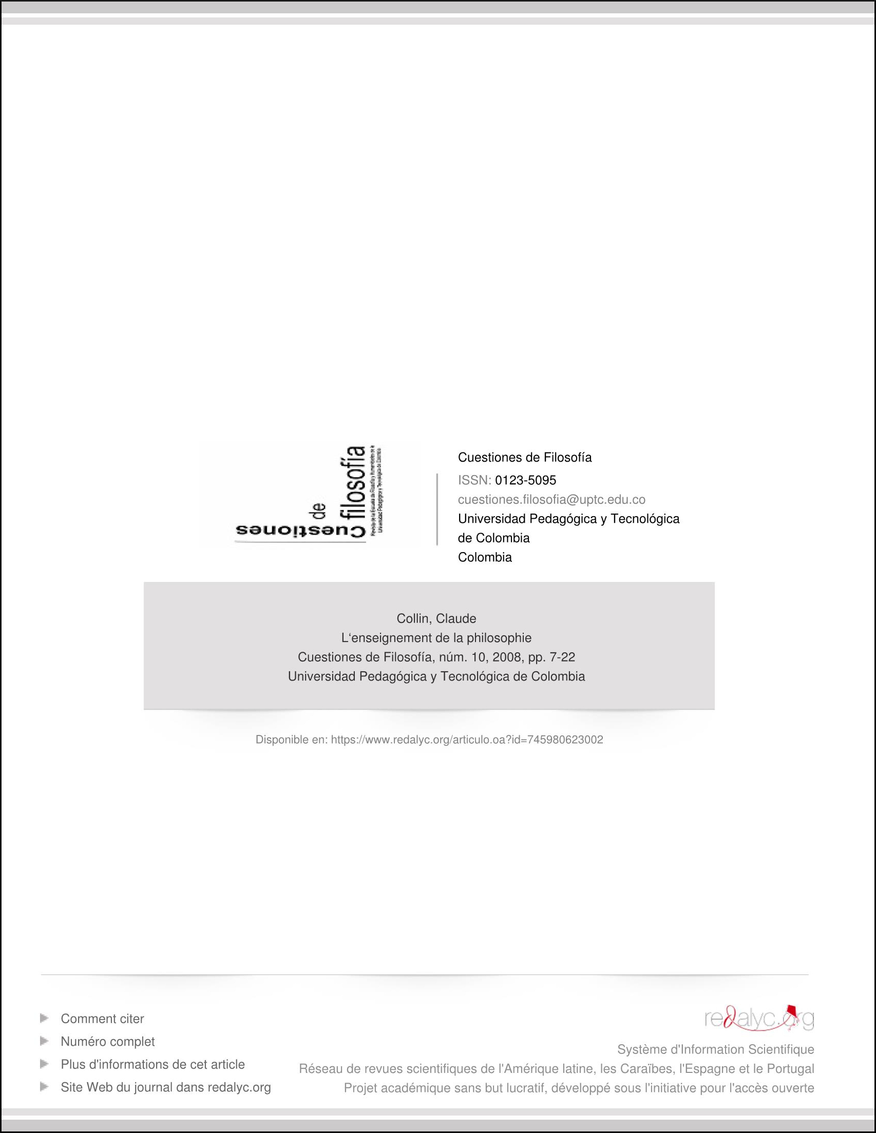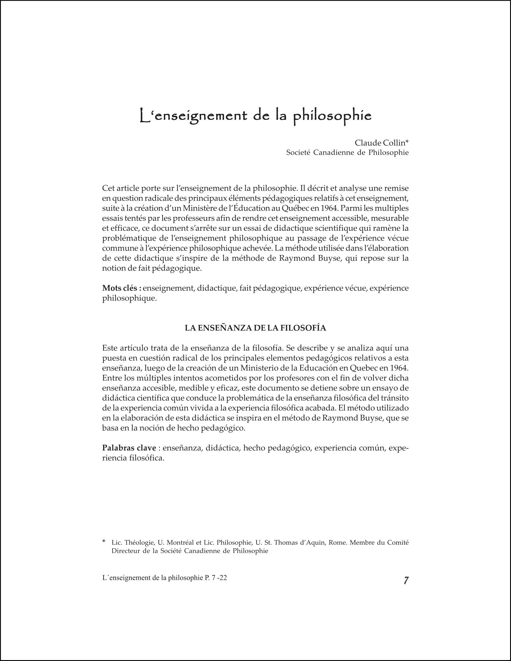 Voir C. Collin, L’Enseignement de la philosophie, Montréal : Institut de recherches didactiques, 1974.