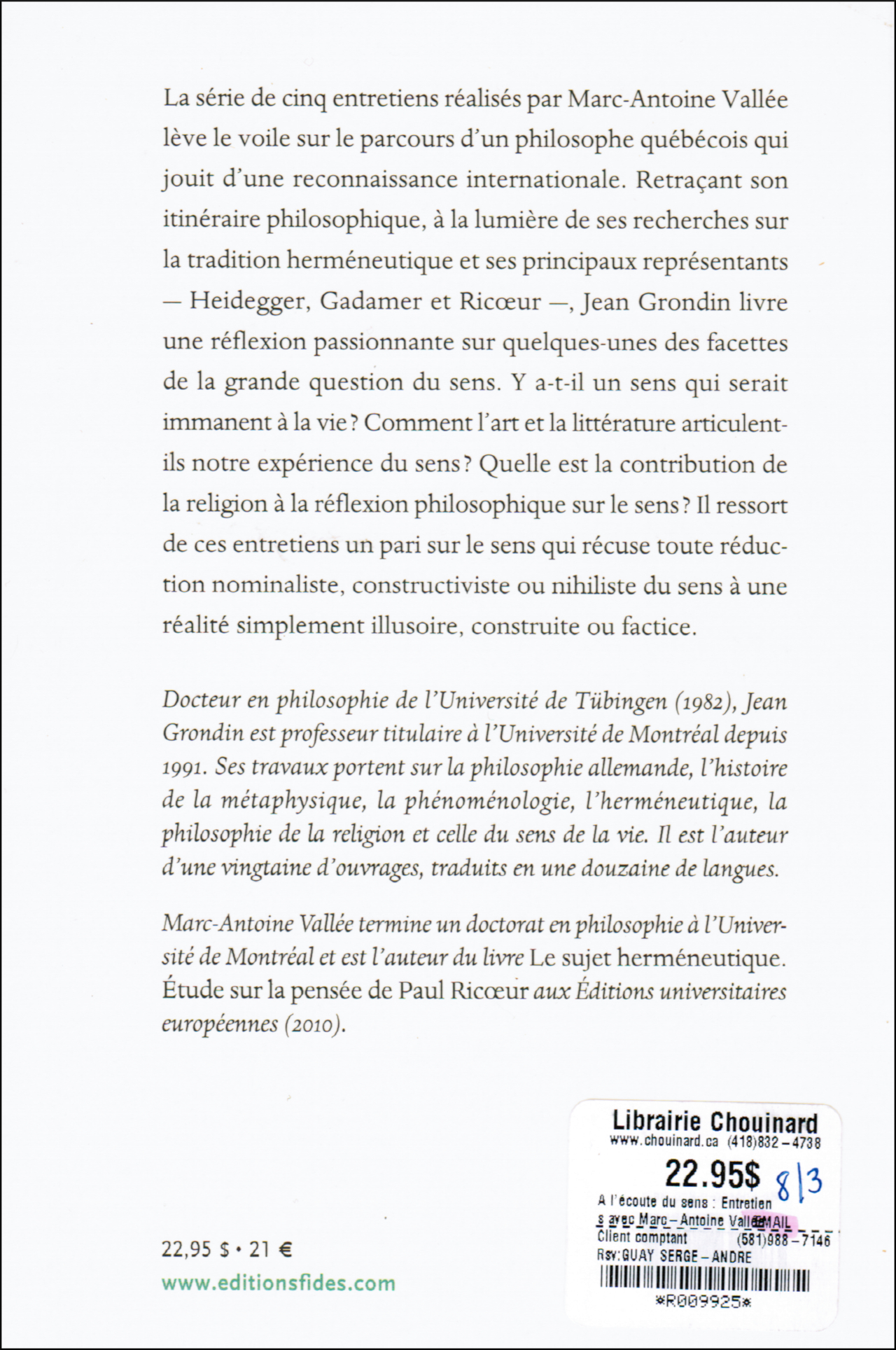 Article # 193 – Jean Grondin, À l’écoute du sens, Entretiens avec Marc-Antoine Vallée, Éditions Saint-Martin (coll. Essentiel Bellarmin) Groupe Fides, 2011