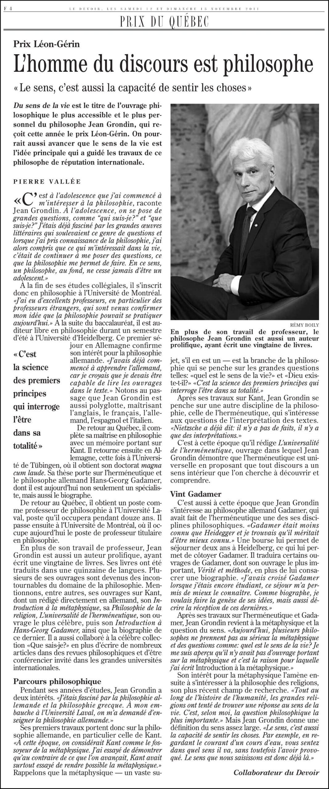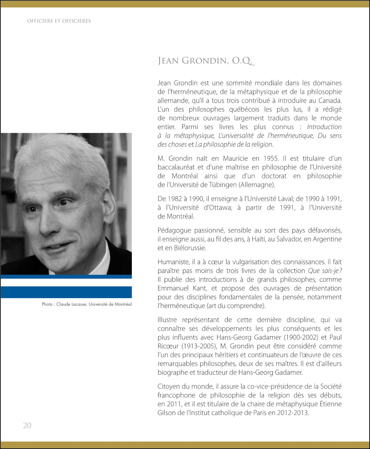 Par toutes ces réalisations et par son engagement en faveur des sciences humaines et de la philosophie, le professeur Grondin contribue de manière admirable à l’essor de son milieu et montre qu’il se soucie au plus haut point de la diffusion du savoir dans le grand public.
