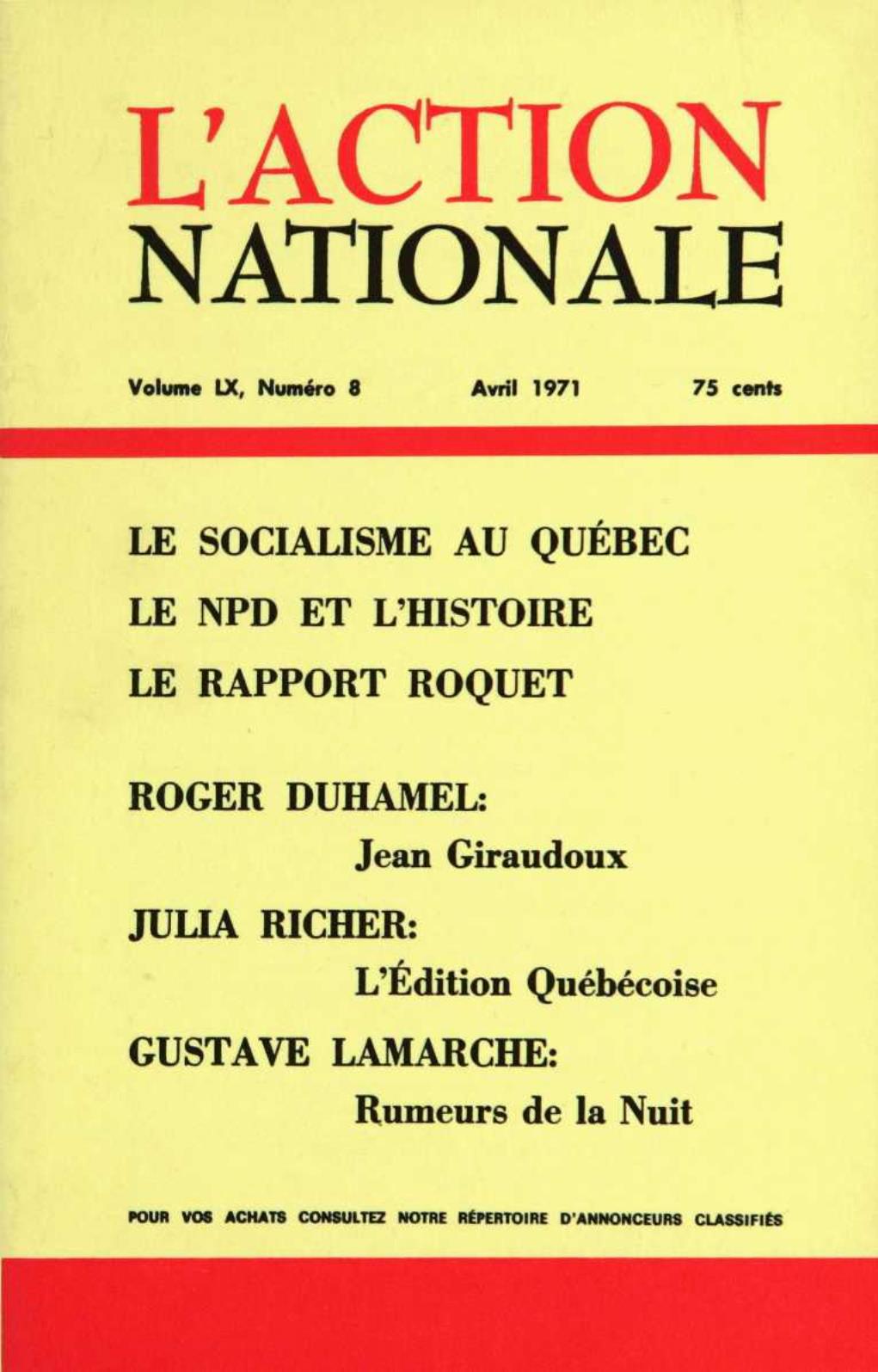 ? « Le rapport Roquet », dans l’Action Nationale, vol. LX, nº 8, et « Le test perpe-philo », dans Prospectives, nov. 1971.
