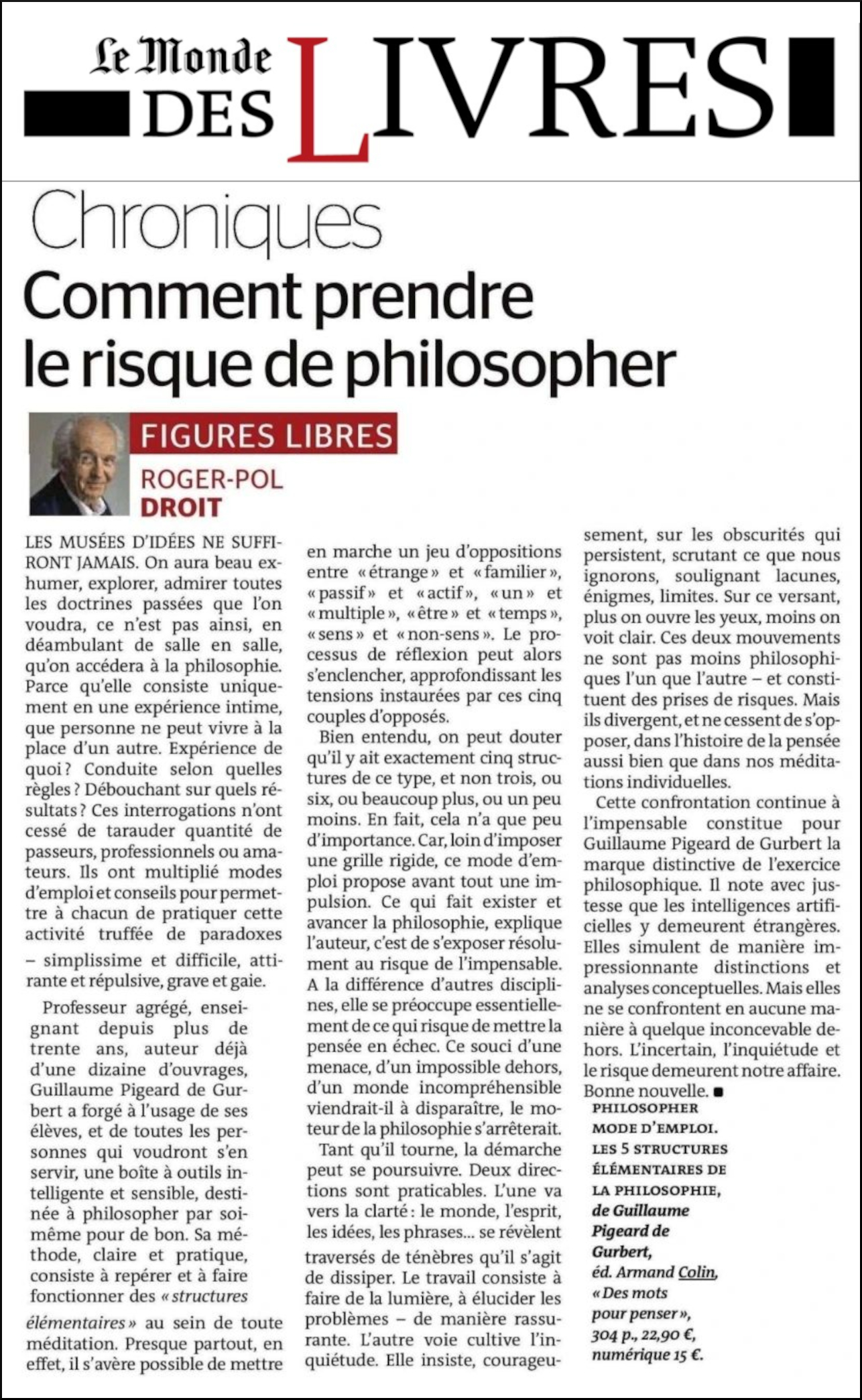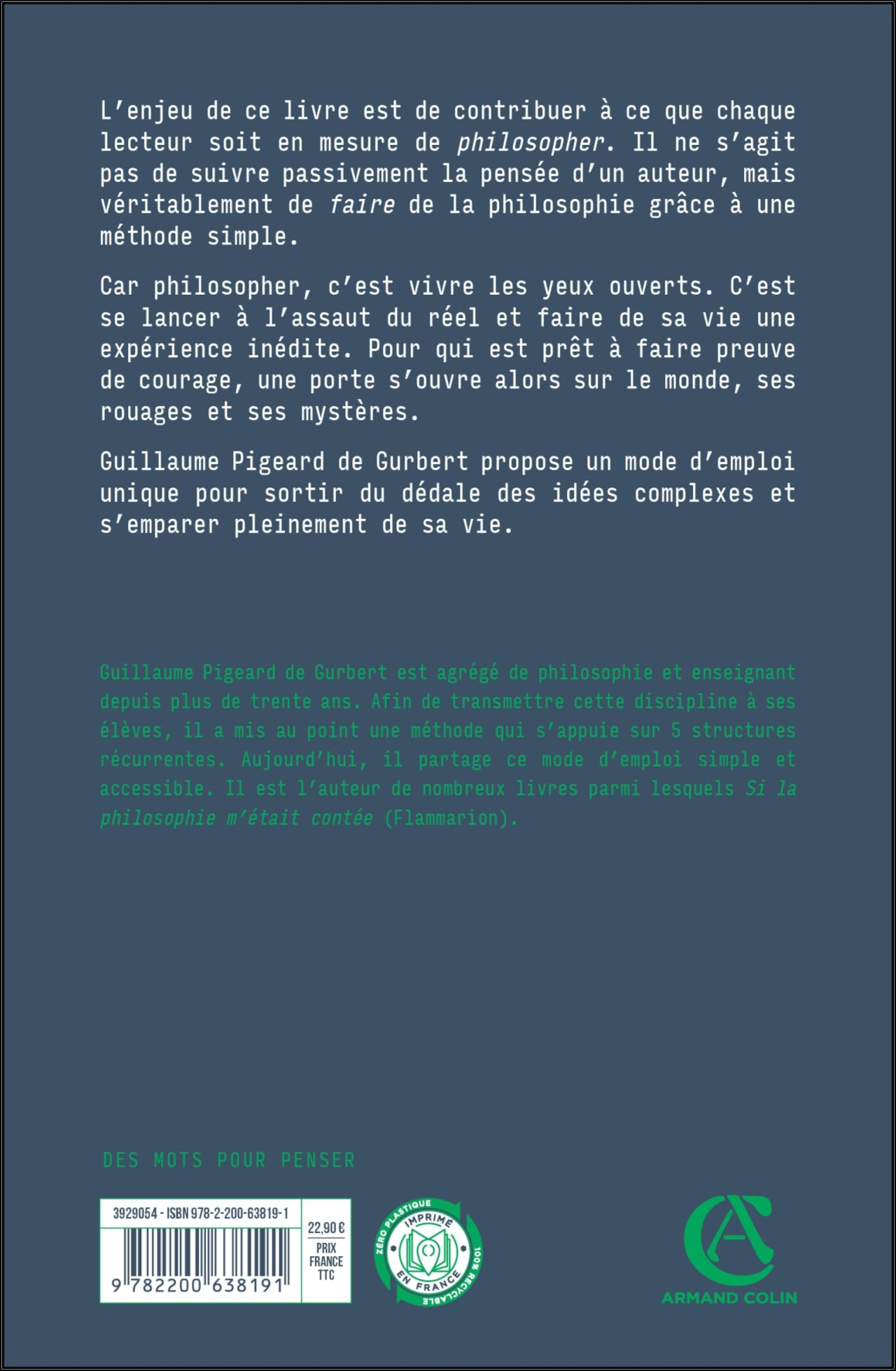 « Guillaume Pigeard de Gurbert a forgé à l’usage de ses élèves, et de toutes les personnes qui voudront s’en servir, une boîte à outils intelligente et sensible, destinée à philosopher par soi-même pour de bon. » Le Monde des Livres