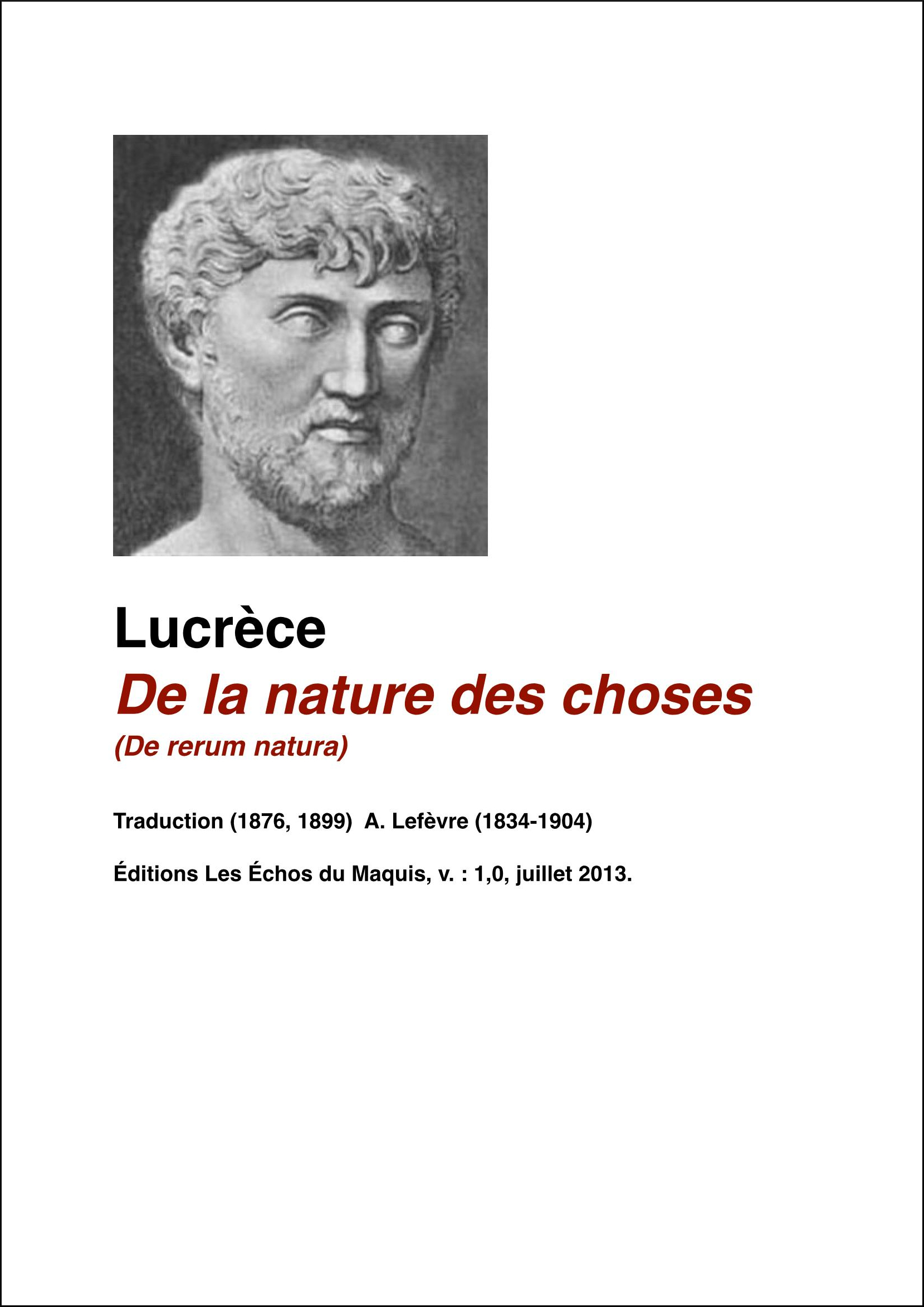 Enfin la Revue de MM. Littré et Wyrouboff, la Philosophie positive, publie depuis deux ans, des fragments étendus d’une traduction complète, en vers, œuvre de dix années, celle-là même qui est aujourd’hui soumise au jugement des lettrés. Ainsi donc, admis dans les collèges, reçu avec faveur à la Sorbonne, critiqué à l’Académie, Lucrèce est désormais un classique. Il est vrai qu’il n’a jamais cessé de l’être pour les amis de la grande poésie et pour les esprits émancipés. Mais tout ce mouvement qui se produit autour de son nom n’est-il pas un signe des temps ? De là, en tout cas, l’opportunité d’une étude où seront résumés quelques renseignements biographiques, trop peu nombreux, et les principaux traits d’une grande doctrine, dont Lucrèce a été, dans l’antiquité, le plus éloquent interprète.